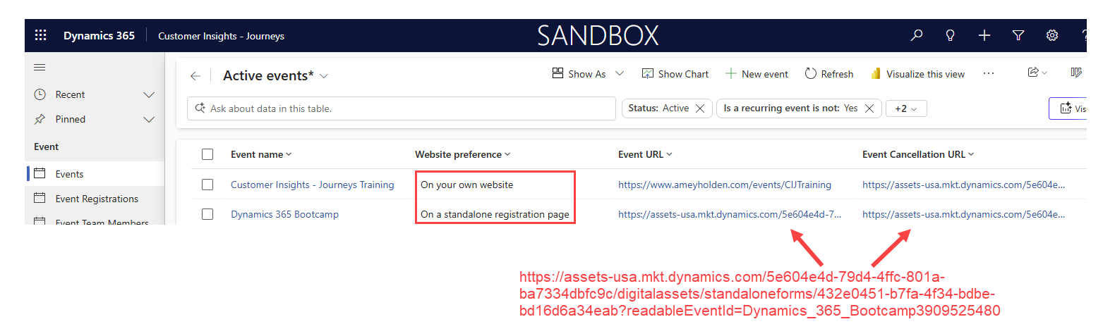 e.g. Event standalone page -> https://assets-oce.mkt.dynamics.com/orgGUID/digitalassets/standaloneforms/FormGUID?readableEventId=ReadableEventID&eventRegistrationId=ER 123456789ABC67382