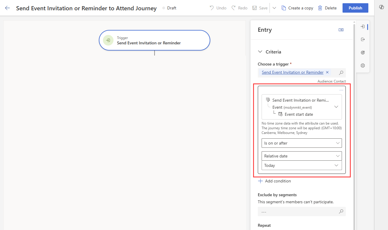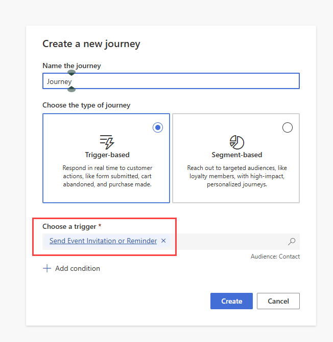 Create a new journey which is ‘Trigger-based’. Choose the trigger you created earlier called ‘Send Event Invitation or Reminder’.