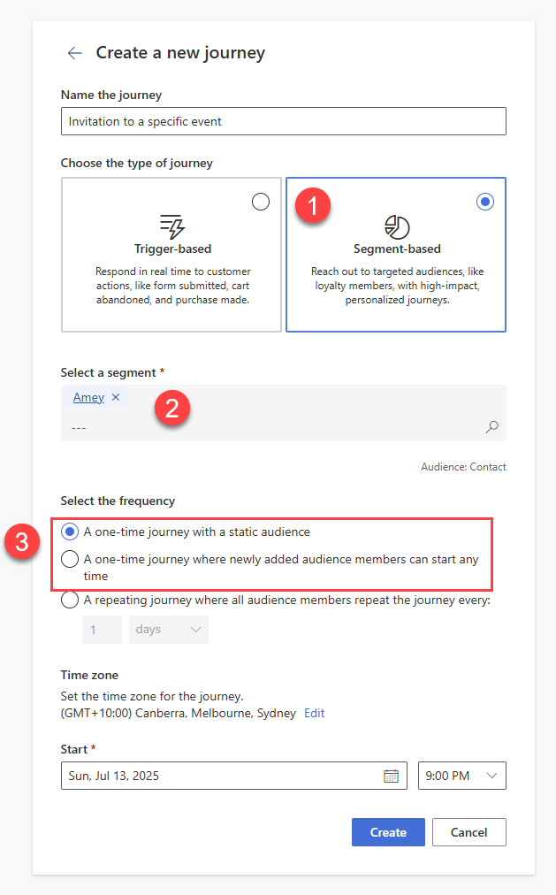 Now that the trigger based journey is live, we can use a segment based journey to trigger the invitations to send. Create a new ‘Segment-based’ journey. Choose a segment of contacts who you would like to invite to the event (you could also update this to be lead based by changing the audience of the trigger to be lead rather than contact). The frequency of the journey is entirely up to you, either works fine with what we are building.