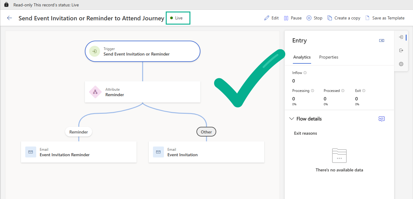Make sure this journey is Live and ready to go before you start trying to send invitations. This journey will remain live indefinitely and will run for all invitation/reminders for all the events you need it to.