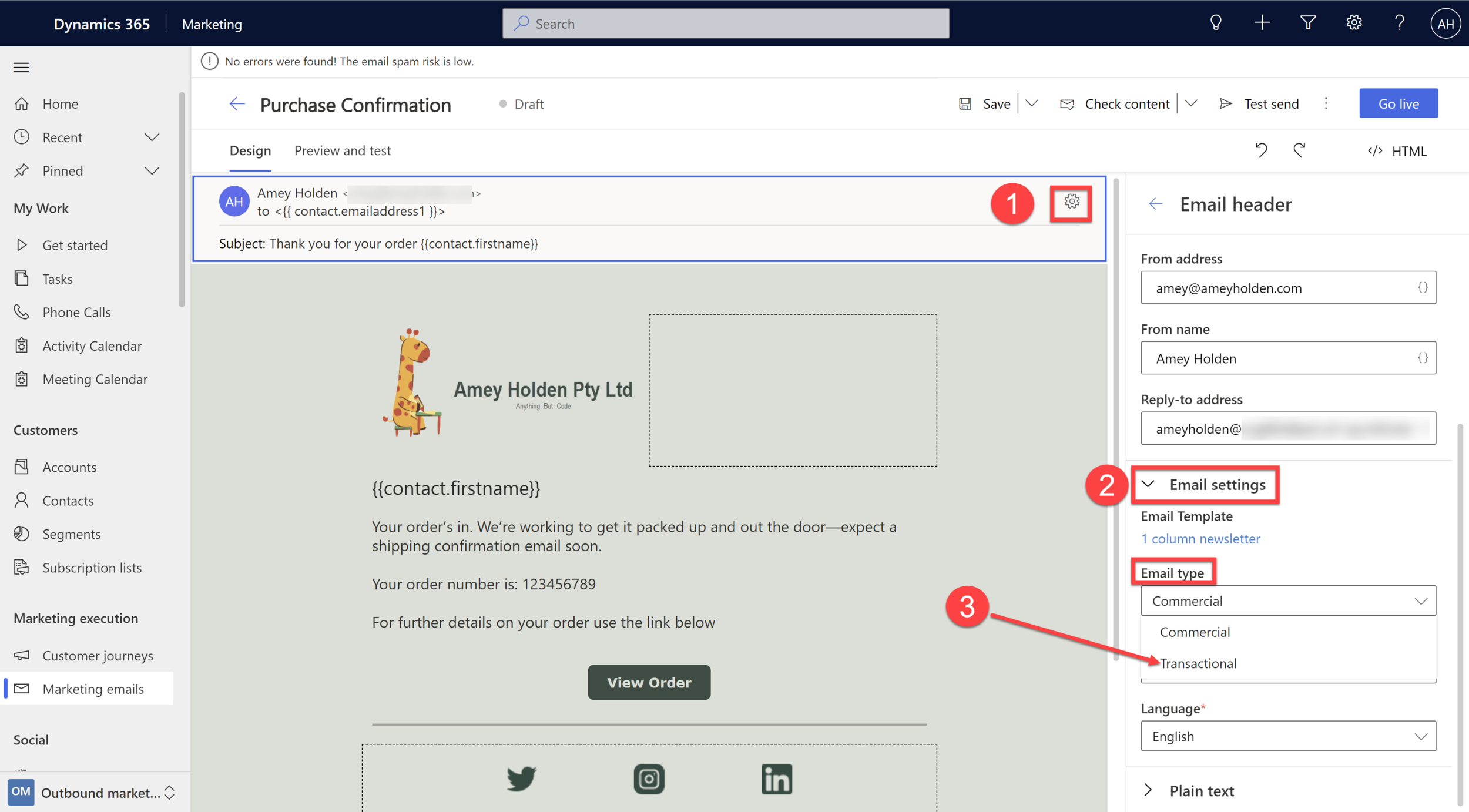 Further reading on Transactional Emails in Dynamics 365 Marketing -> https://docs.microsoft.com/en-us/dynamics365/marketing/email-properties#set-the-legal-designation-to-identify-each-message-as-either-commercial-or-transactional