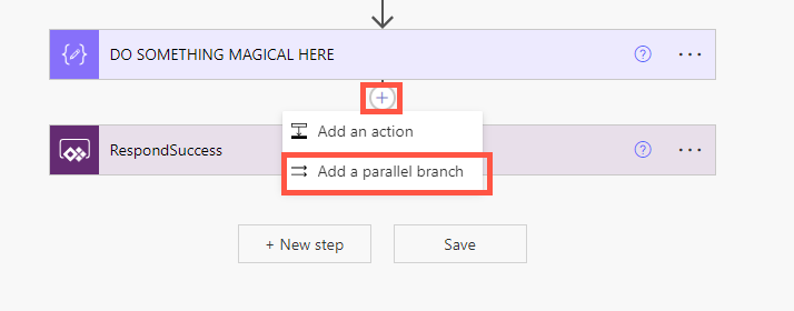 Above the ‘RespondSuccess’ action select the + and ‘Add a new parallel branch’.
