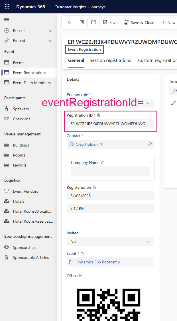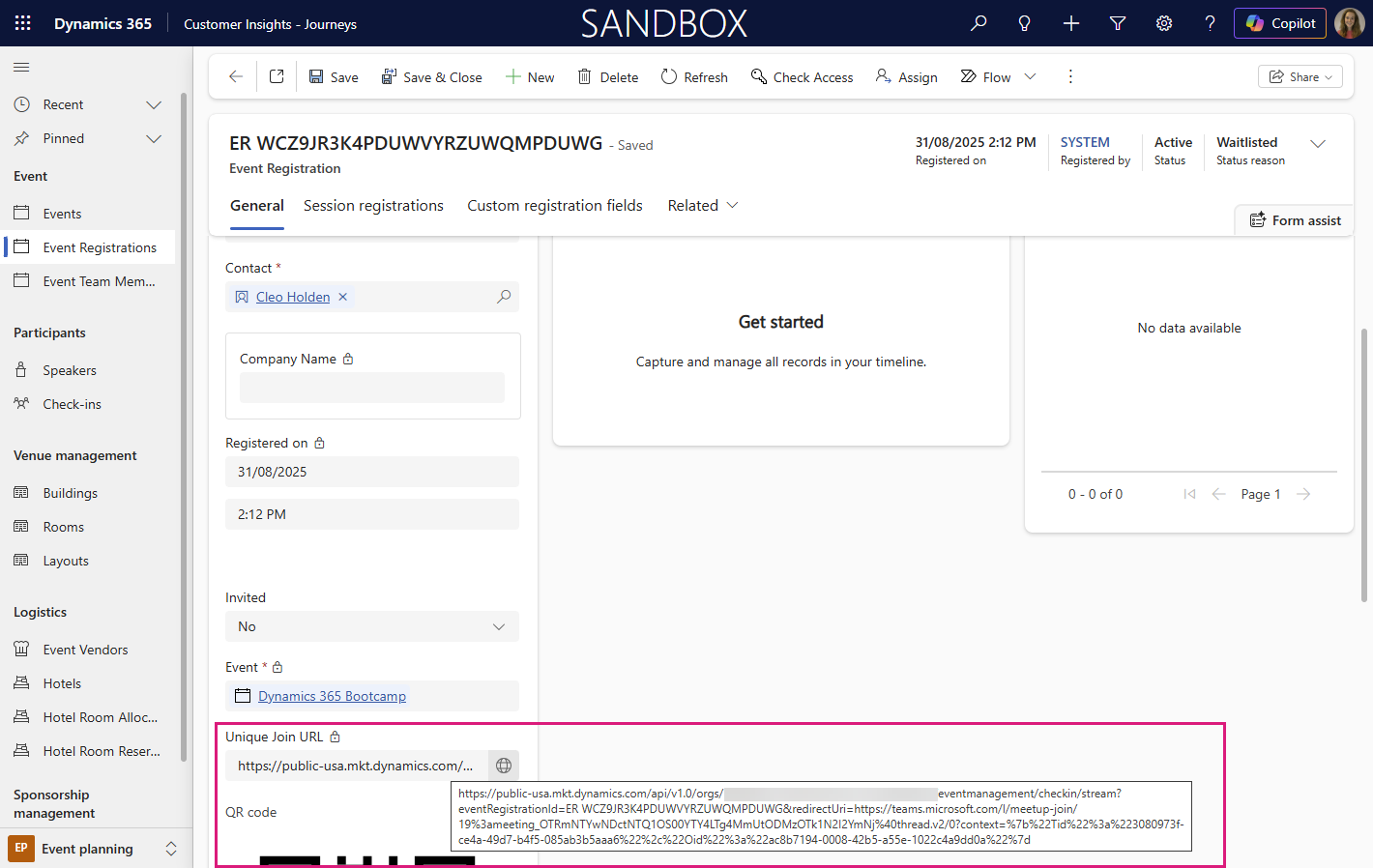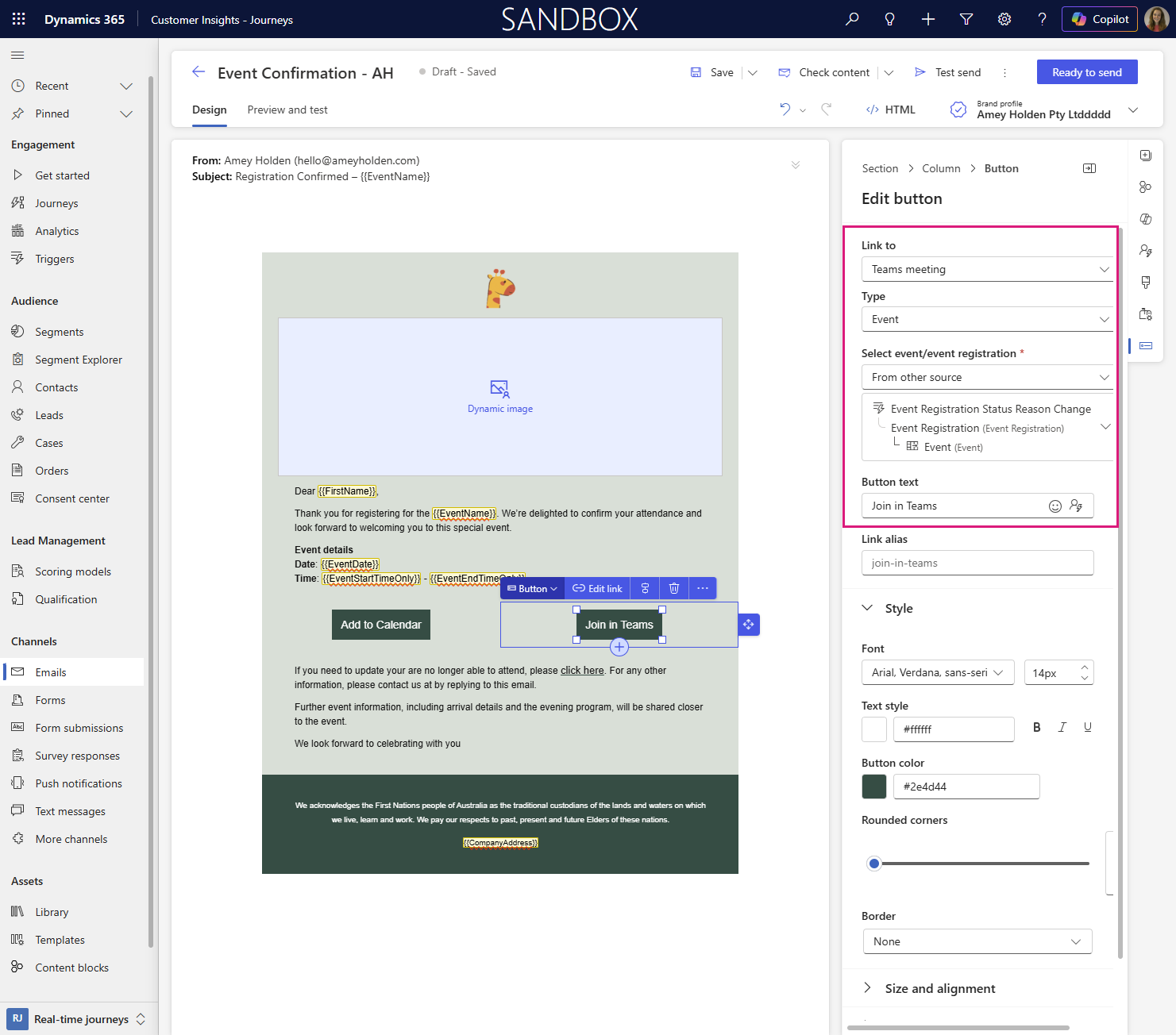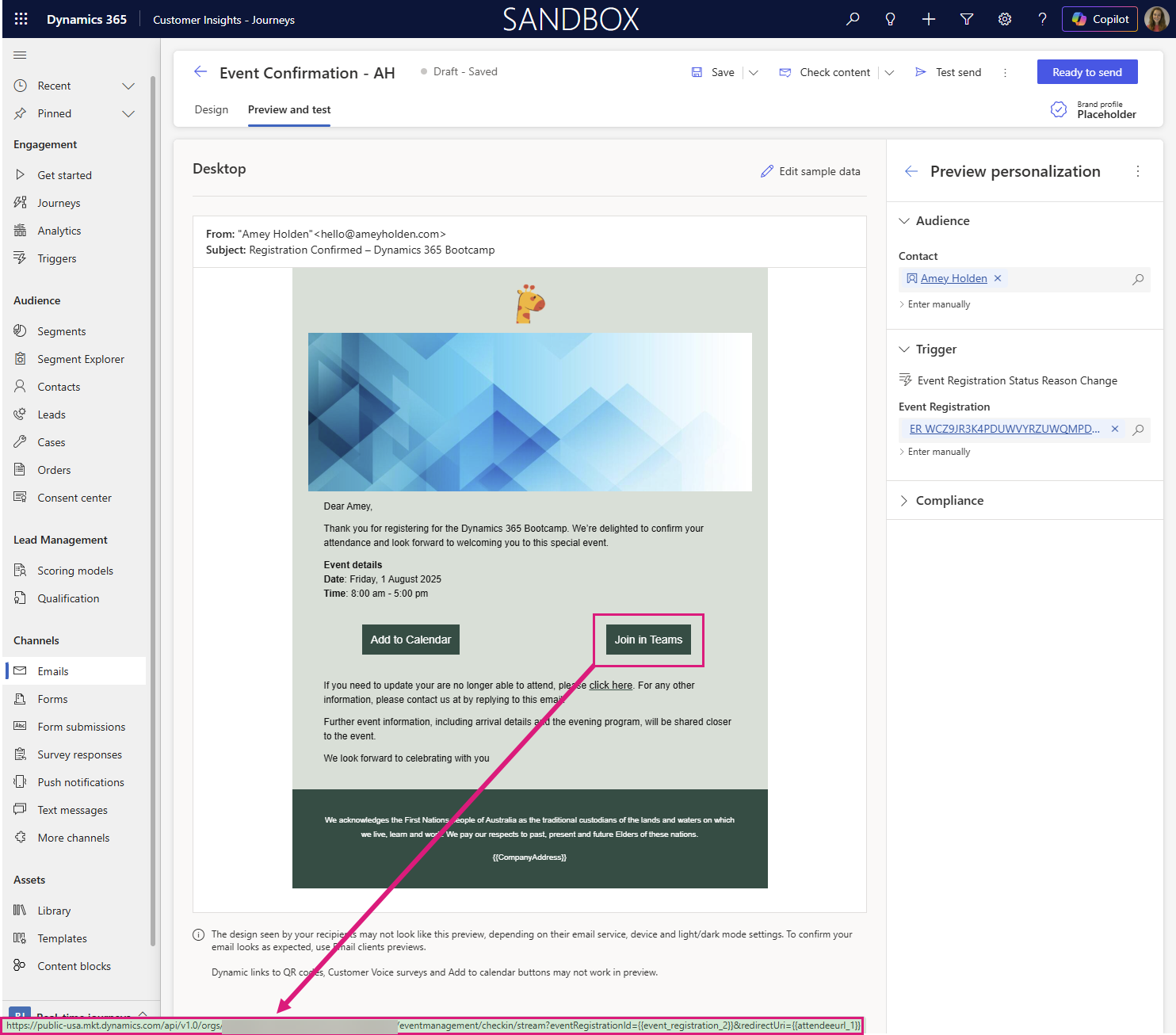 Customer Insights – Journeys integrates with Microsoft Teams to support trackable meeting experiences. The ‘standard’ way to do this is by adding the ‘Join in Teams’ button to event confirmations and reminders via a journey. Unique join links can be generated for each event registration. These links enable individual-level tracking of attendance and engagement, which flows back into the event in Dynamics 365 as ‘Check-ins’ which works beautifully.